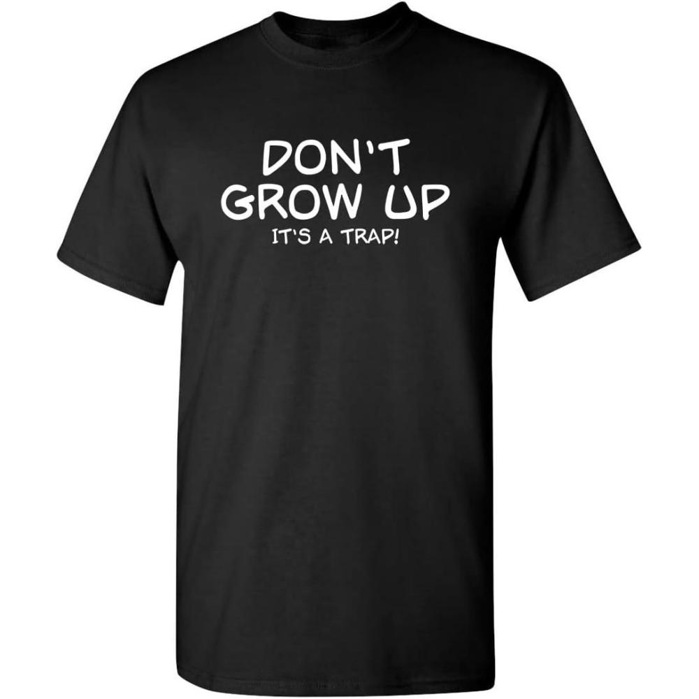 Add humor and personality to your wardrobe with the Don’t Grow Up, It’s A Trap Funny Novelty Graphic T Shirt, designed for anyone who appreciates a clever sarcastic twist on life. This shirt blends comfort, style, and comedy into a must-have piece perfect for casual wear, parties, or gifting. The witty slogan sparks laughter and conversation wherever you go, making it a great way to share your playful side while staying comfortable and stylish. Crafted from premium cotton, this T Shirt provides lightweight softness and breathability so you stay cool and relaxed throughout the day. Its durable construction with double stitched hems ensures it holds its shape wash after wash. The high quality graphic print keeps its bold appearance without fading, allowing the message to remain just as sharp as your sense of humor. Whether lounging at home, hanging with friends, or running errands, this tee fits every occasion with ease. The unisex design makes this shirt versatile and flattering for men, women, teens, and kids. Available in multiple sizes, it offers a comfortable classic fit that pairs effortlessly with jeans, shorts, or joggers. Great as a birthday gift, holiday present, or simply a treat for yourself, this novelty graphic tee is ideal for anyone who loves a witty saying. Perfect for everyday wear, this Don’t Grow Up, It’s A Trap T Shirt is a standout addition to any collection of casual clothing. It’s also a fun choice for school, work-from-home outfits, or as a unique gift for friends and family who appreciate humor. Bring joy, style, and sarcasm together in one soft, reliable tee that never fails to get a smile.