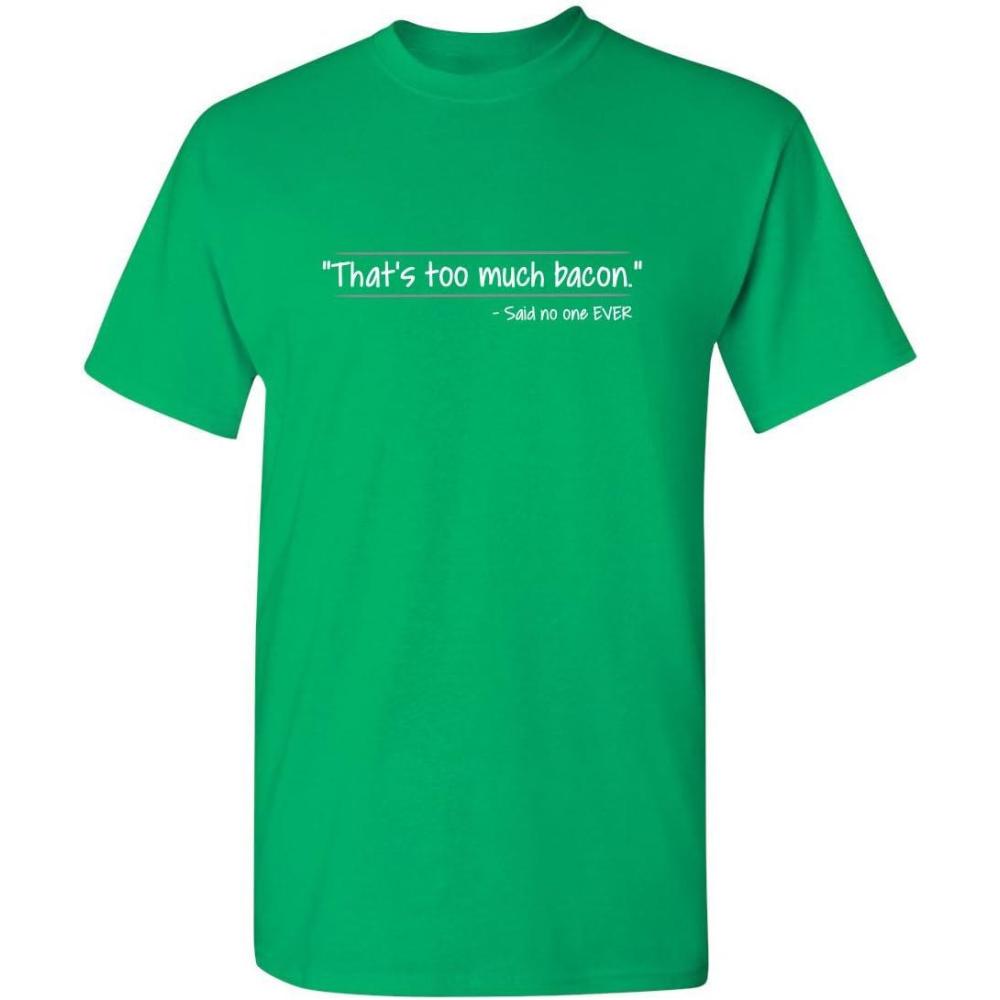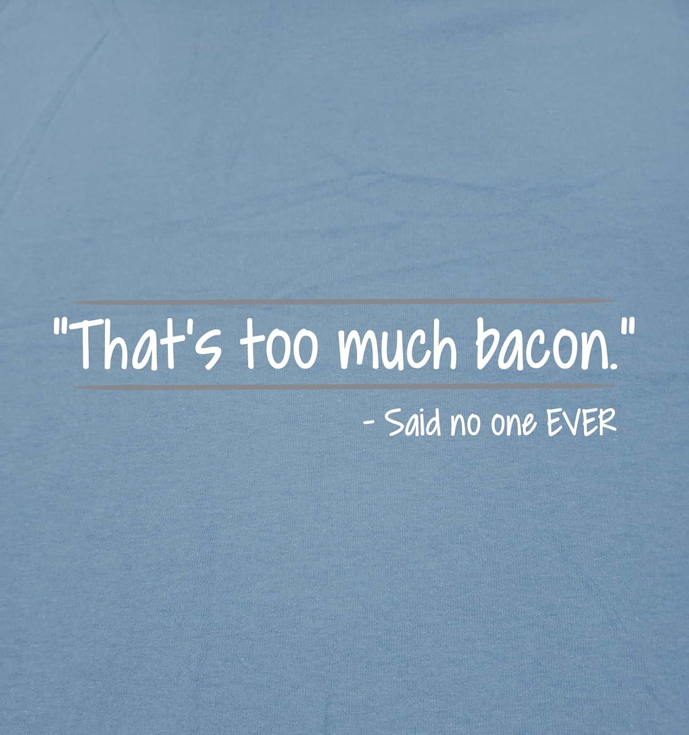 The T-shirt boldly proclaims, “That's Too Much Bacon, Said No One Ever,” capturing the universal love for this crispy delight. It's perfect for bacon enthusiasts who appreciate humor and want to express their passion for this savory treat. The phrase, printed in eye-catching fonts, resonates with anyone who's ever craved just one more slice. Whether you're grilling on the weekend or simply enjoying breakfast, this T-shirt adds a dash of fun to your wardrobe, celebrating the undeniable truth: there's no such thing as too much bacon.