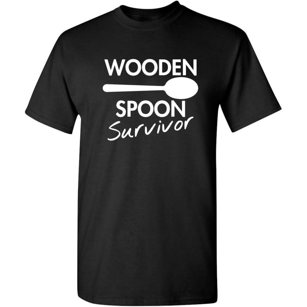 Wooden Spoon Survivor Funny Humor Tee | Mens T-Shirts Casual Style | Bold Mens Graphic Novelty Sarcastic T-Shirts(Black)