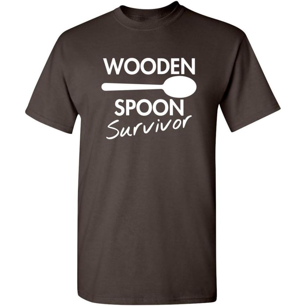 Wooden Spoon Survivor Funny Humor Tee | Mens T-Shirts Casual Style | Bold Mens Graphic Novelty Sarcastic T-Shirts(Brown)